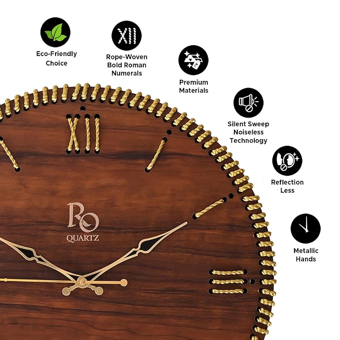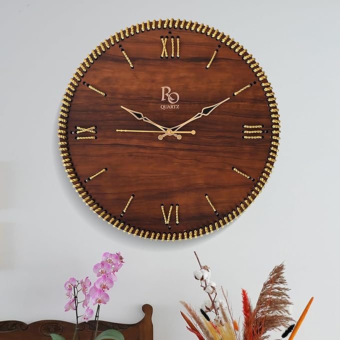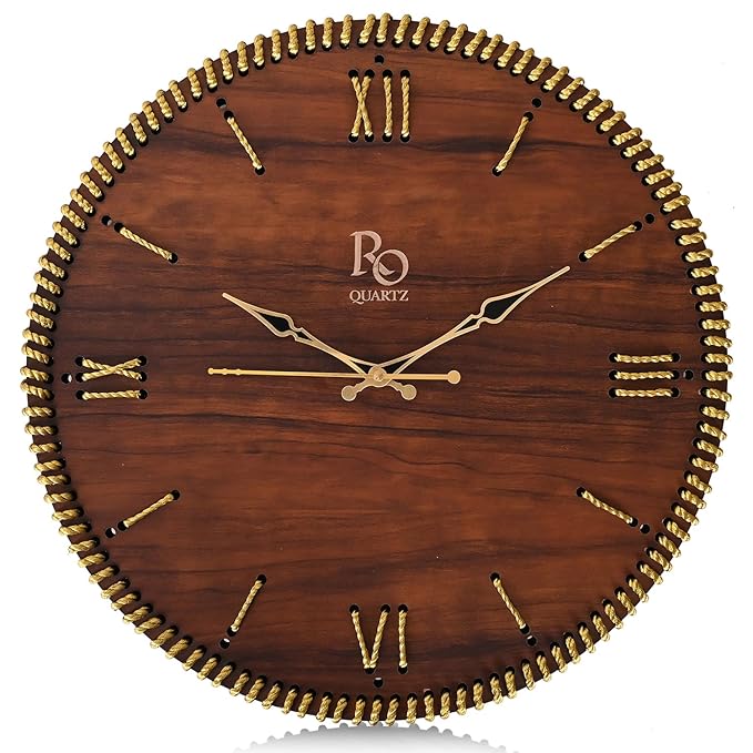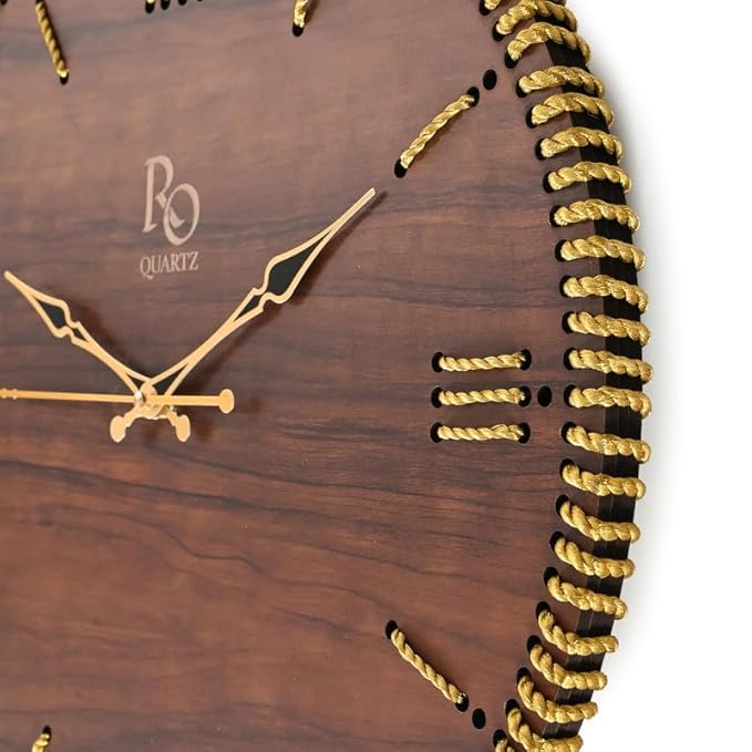 - Elegant Rope Border Design: Crafted with a distinctive decorative gold rope border, this round wooden wall clock adds charm to any space. The golden rope detail enhances the overall appeal, making it an eye-catching piece for living rooms, bedrooms, offices, or entryways. A blend of texture and artistry, it effortlessly uplifts any interior setup. Features Roman numerals at the 12, 3, 6, and 9 o’clock positions, while the rest of the hour markers are represented by slim golden rope dash accents.